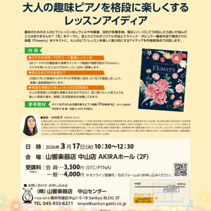 English 2025年3月に発売した「オトナ女子のための聴き映えピアノ曲集「Flowers」」のトークレクチャーコンサートが大阪にある、カワイ梅田で行われま …