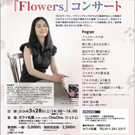 English 2025年3月に発売した、オトナ女子のための聴き映えピアノ曲集「Flowers」(カワイ出版)のトークコンサートをカワイ札幌店さまに開催してい …
