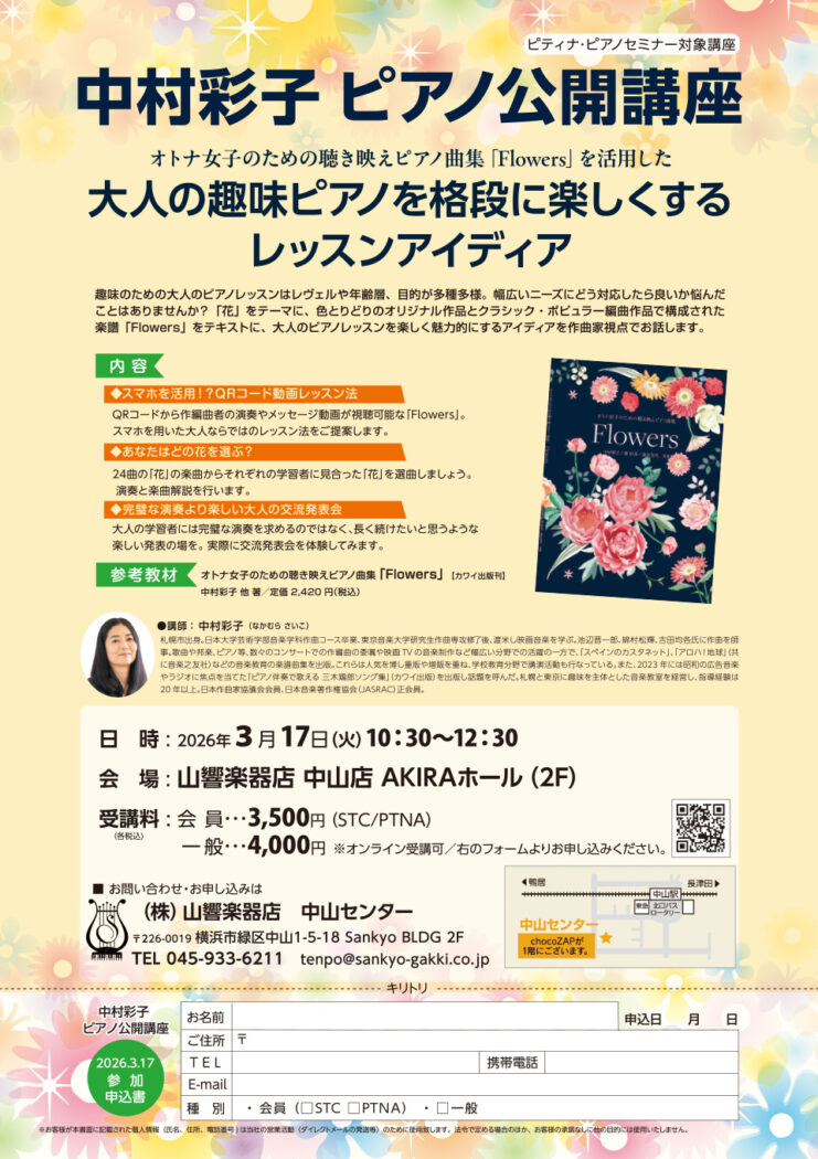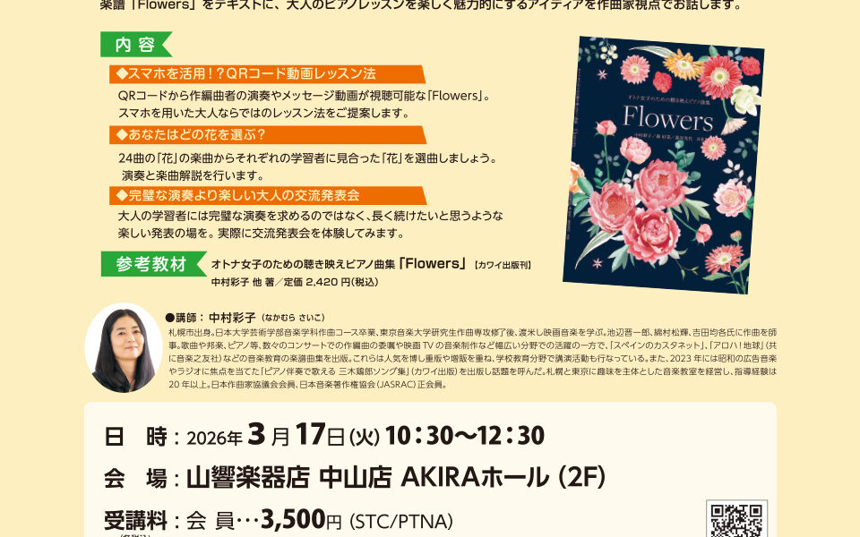 中村彩子(他2名共著)によって2025年3月に発売されたピアノ楽譜集「オトナ女子のための聴き映えピアノ曲集 Flowers 」(カワイ出版)を使用したセミナーが横浜市で開催されることとなり、山響楽器中山店様にお呼びいただきます。