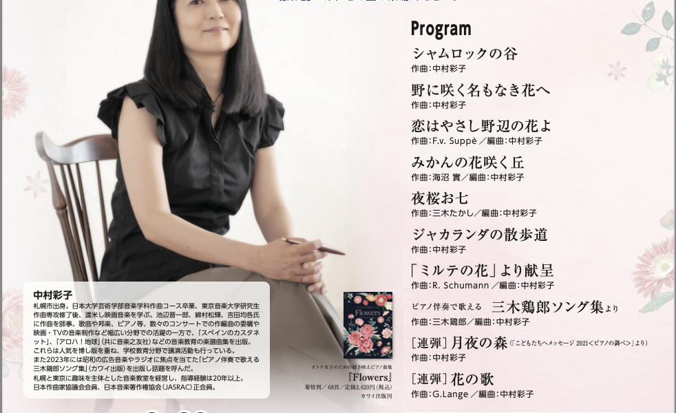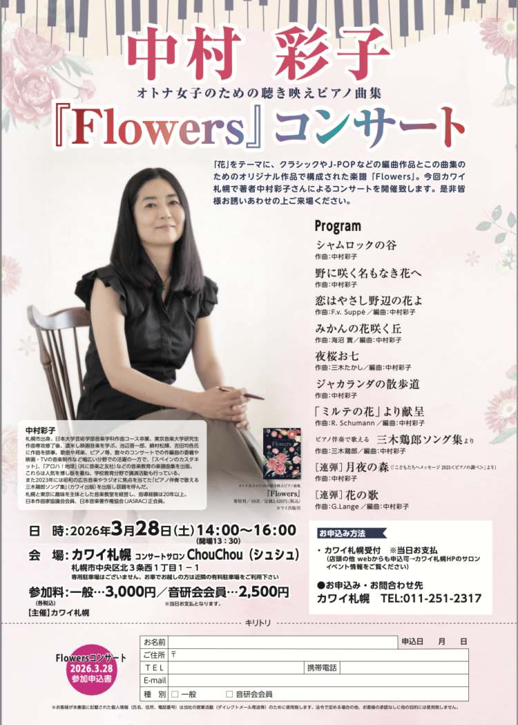 2025年3月に発売した、オトナ女子のための聴き映えピアノ曲集「Flowers」(カワイ出版)のトークコンサートをカワイ札幌店さまに開催していただきます。