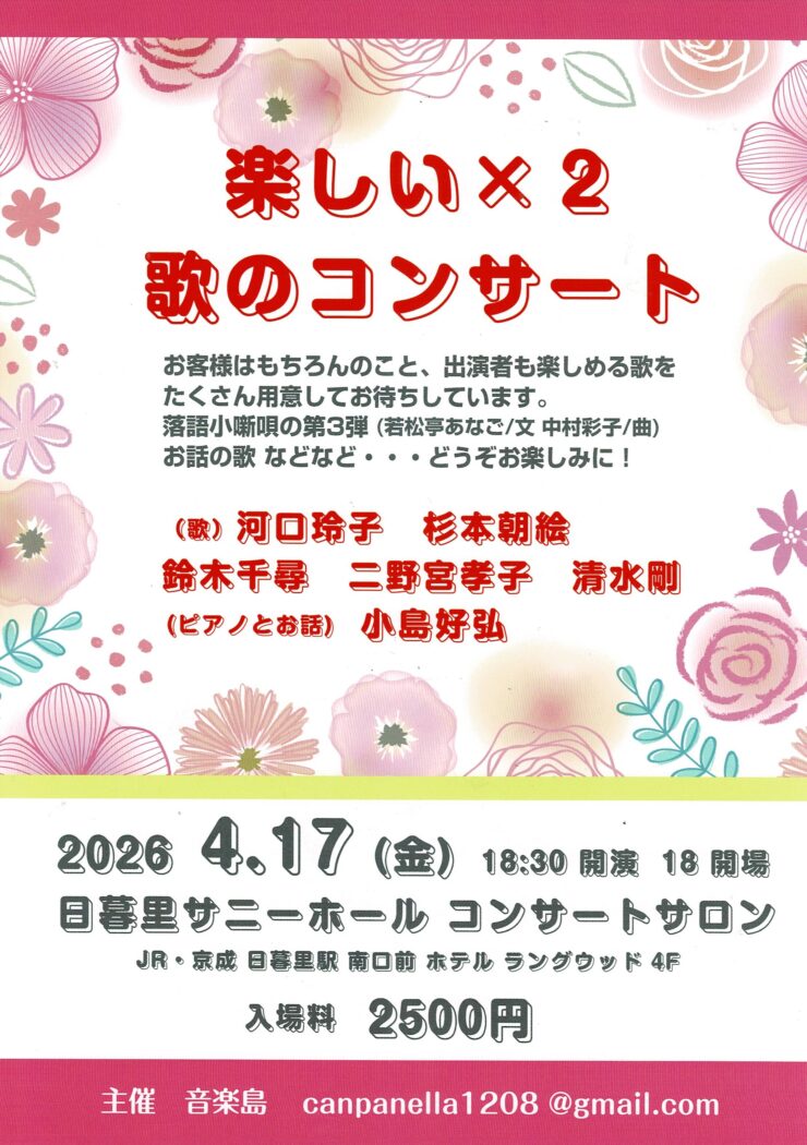 毎年恒例の「楽しい×2 歌のコンサート」にて2024年に新作委嘱され、好評だった落語家の若松亭あなごさんの上方落語の創作小噺を歌曲にした、同声二重唱組曲「すごく短い落語たち-およそ一四◯字の落語小噺集」(中村彩子作曲)。