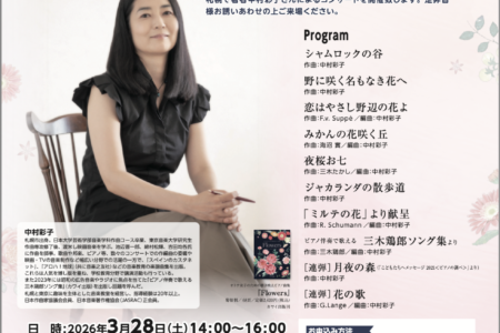 コンサート、楽譜販売【3/28開催】中村彩子 オトナ女子のための聴き映えピアノ曲集 「Flowers」コンサート【カワイ札幌】更新日:2026年3月9日2026年2月24日 English 2025年3月に発売した、オトナ女子のための聴き映えピアノ曲集「Flowers」(カワイ出版)のトークコンサートをカワイ札幌店さまに開催してい …